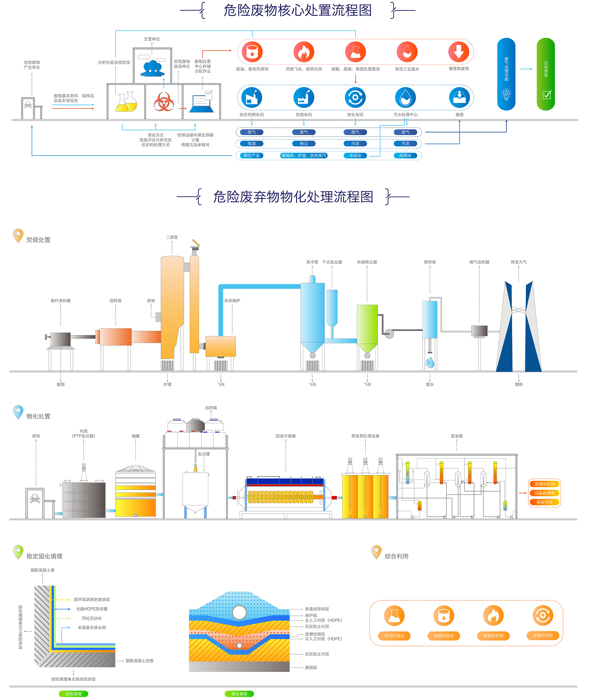 业务涵盖危废分类、收集、储存、运输、处置的全程管理,提供平台级的危废处理解决方案和综合服务。 通过区域内各产废企业的危废数据和产废规律摸底,构建废物收集体系,并通过大数据分析与整合,合理设计收运路线,构建收运车辆管理体系,实现高效的危废收转运以及透明、有效的危废去向监管。 具备大型危废处理项目建设和运营经验,工艺技术储备全面,可为客户提供焚烧处置、物化处置、稳定固化填埋、综合利用、危废库存管理、现场工业服务等整体解决方案。