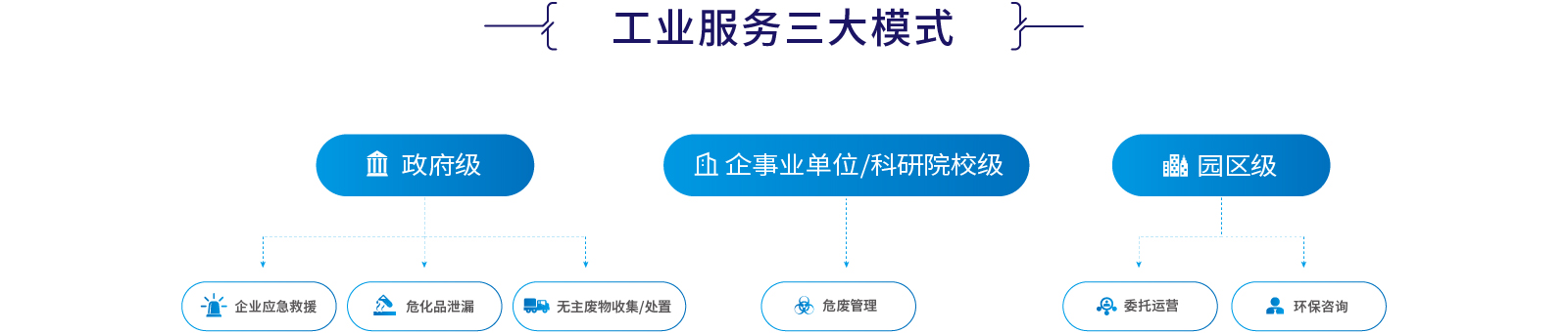 可提供危废项目整体规划及各专项处理设施建设及运行咨询服务及项目托管运行等。协助企业、工业园区及政府开展“工业环境综合服务”工作,规范危险废物的贮存、转移及处置,助力建设美丽中国。 政府级:成为各级政府在工业危险废物领域中的依托单位,对各地区的环境事件提供应急救援,包括企业应急救援,危化品泄露、无主废物收集/处置等服务。 园区级:成为各产业园区的合作伙伴,为园区提供园区规划阶段、建设阶段、项目引入阶段及正常运行阶段全方位的环保咨询、托管运营等服务。 企事业单位/科研院校级:成为各企事业单位/科研院校在危废领域中的“环保管家”,为合作客户提供项目全过程的资金投入、技术支持、以及危险废物管理服务。