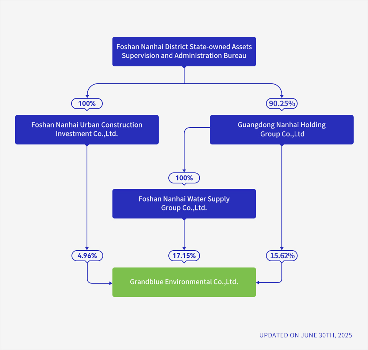 In accordance with the Approval of Acquisition of Assets and Raising of Supporting Funds by Grandblue Environment Co., Ltd. from C&G Environmental Protection (Hong Kong) Co., Ltd. issued by the CSRC on December 11, 2014 (CSRC Approval No.[2014]1336), the company issued a total of 91,019,417 shares to C&G Environmental Protection (Hong Kong) Co., Ltd. on December 25, 2014 to acquire 100% equity interest in C&G China and 46,534,611 shares to Nanhai City Investment to acquire 30% equity interest in Gas Development. The share capital changed to 716,796,909 shares.